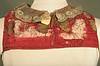 Der Goller aus himbeerotem Seidenstoff mit eingewebten goldenen Blumen ist wattiert, Muschelspitze und Tüllborte zieren den Halsausschnitt.