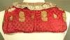 Materialbeschreibung: Oberstoff himbeerroter Broché mit goldenen Blumen und Blättern. Den Grund bilden eingewebte Karos, die sich aus einem Bindungswechsel zwischen Rips- und Atlasbindung ergeben, Futter Baumwollbatist. Der Oberstoff des Gollers ist stark beschädigt (Lichtschaden?).